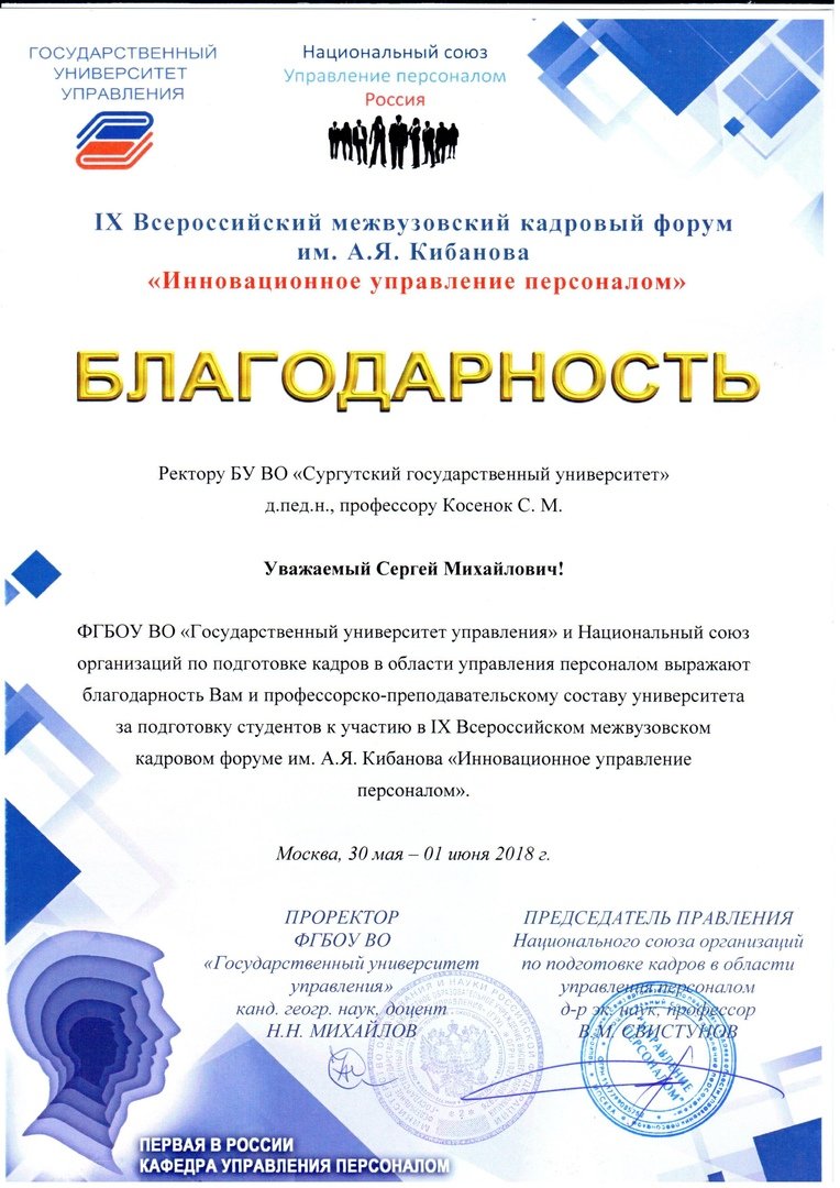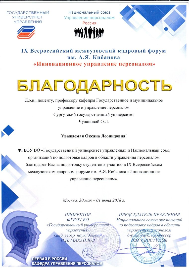 В начале июня 2018 года в Государственном университете управления состоялся IX Всероссийский межвузовский кадровый форум (с международным участием) им. А.Я. Кибанова «Инновационное управление персоналом». Организатором форума выступила, по традиции, первая кафедра управления персоналом в РФ.