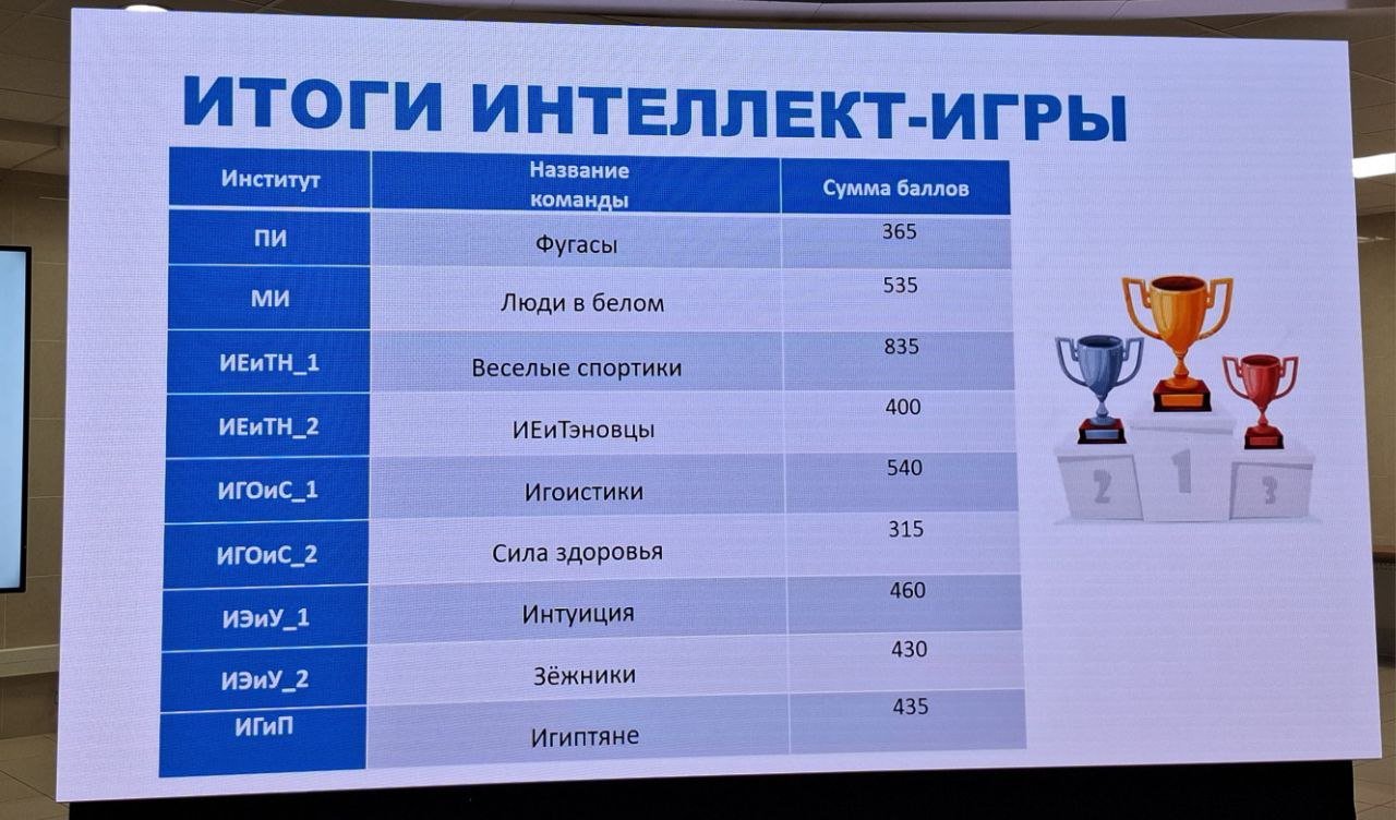 1-е место заняла сборная команда ИЭиУ; 2-е ‒ ПИ; 3-е ‒ ИГОиС; 4-е ‒ МИ; 5-е ‒ ИЕиТН; 6-е ‒ ИГиП.