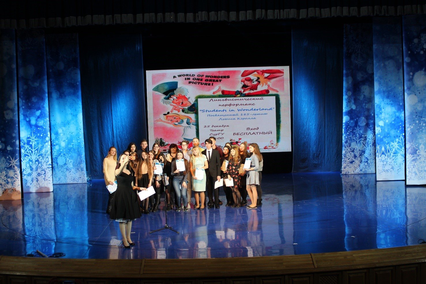 25 декабря 2017 года в театре СурГУ прошел второй лингвистический перфоманс «Лингвисты в стране чудес». Студенты направления «лингвистика» организовали и провели праздник-концерт, посвященный 185-летию со дня рождения Льюиса Кэрролла. Со сцены звучали песни, танцы и стихотворения на английском, немецком и французском языках. С приветственным словом выступили заведующие кафедрами лингвистического направления Ибрагим Курбанов, Александр Евласьев, Лариса Сычугова и наградили лучших студентов благодарственными письмами за научную работу, а также отличную учебу и активную общественную деятельность. Концертная программа, подготовленная студентами направления «лингвистика» ИГОиС сопровождалась бурей аплодисментов гостей.