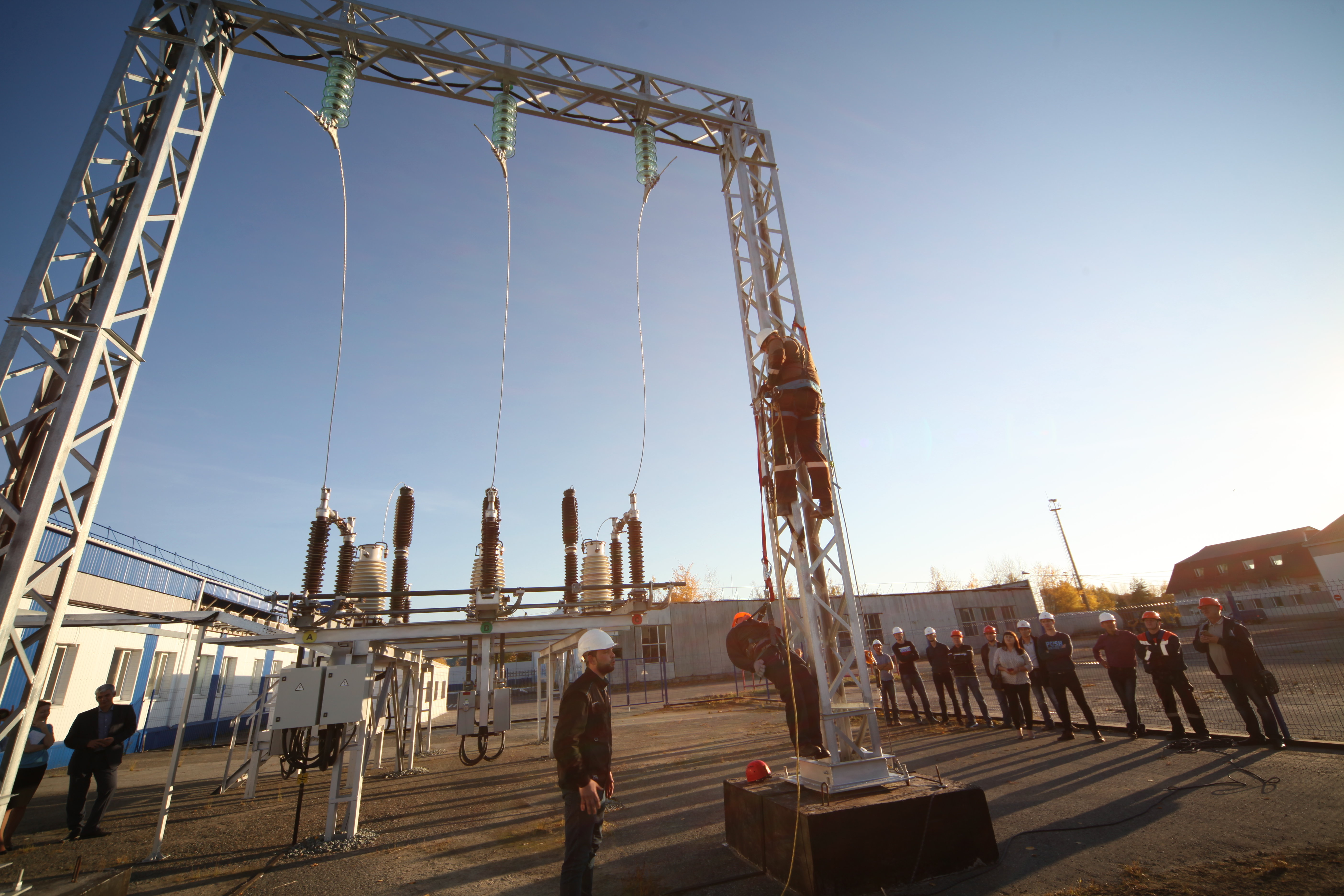 Но и на этом обширная программа не закончилась. Студентам также продемонстрировали подстанционное оборудование, трансформаторы тока, выключатели, разъединители и даже, как проходит работа на высоте. Завершилась экскурсия знакомством со спецтехникой.