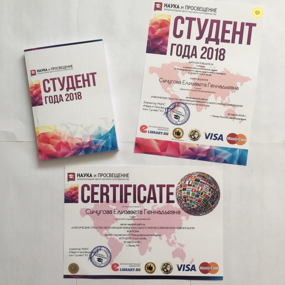 Замечательная организация мероприятия, теплый прием, высокие стандарты, предъявляемые к научным исследованиям, поразили меня как молодого исследователя. Кроме пленарных заседаний и параллельных сессий, проходили презентации стендовых докладов, выставка инноваций и круглые столы. Я получила диплом победителя I степени, сертификат в секции «Филологические науки» IV Международного научно-практического конкурса «Студент года 2018: Лучшая научная работа» за работу «Лексические средства экспликации фикционального мира в современном английском фэнтези (на материале F. Jones «The Faerie Path»)», которую выполняла под руководством доктора филологических наук, профессора кафедры английской филологии РГПУ им. А. И. Герцена Виктории Клейменовой и кандидата филологических наук, доцента кафедры лингвистики и переводоведения СурГУ Ларисы Сычуговой. Руководство МЦНС выразило благодарность за оказанное содействие в подготовке научно-исследовательской работы научным руководителям. По итогам конкурса моя работа была опубликована в сформированном сборнике статей, который регистрируется в РИНЦ и в открытом доступе размещается в Elibrary.ru.