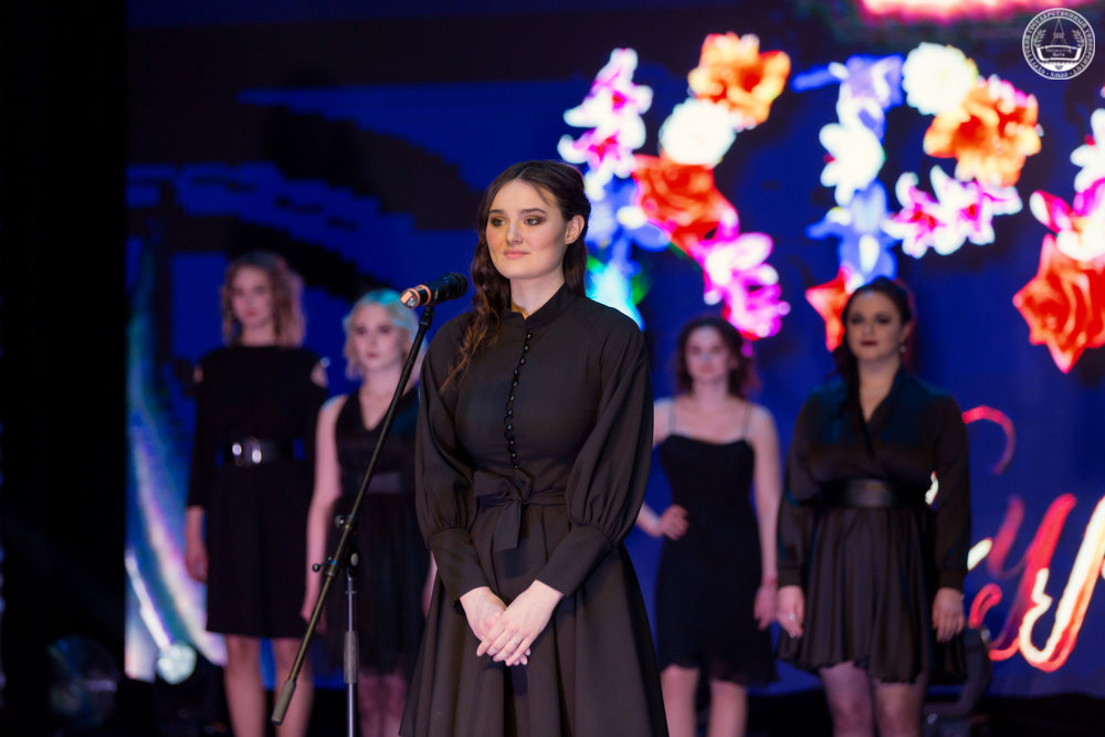 Юноши, участники ранее проведенного «Мистер СурГУ – 2021», сопроводили шикарных дам в вечерних нарядах на сцену, где все они застыли в волнительном ожидании результатов конкурсов.